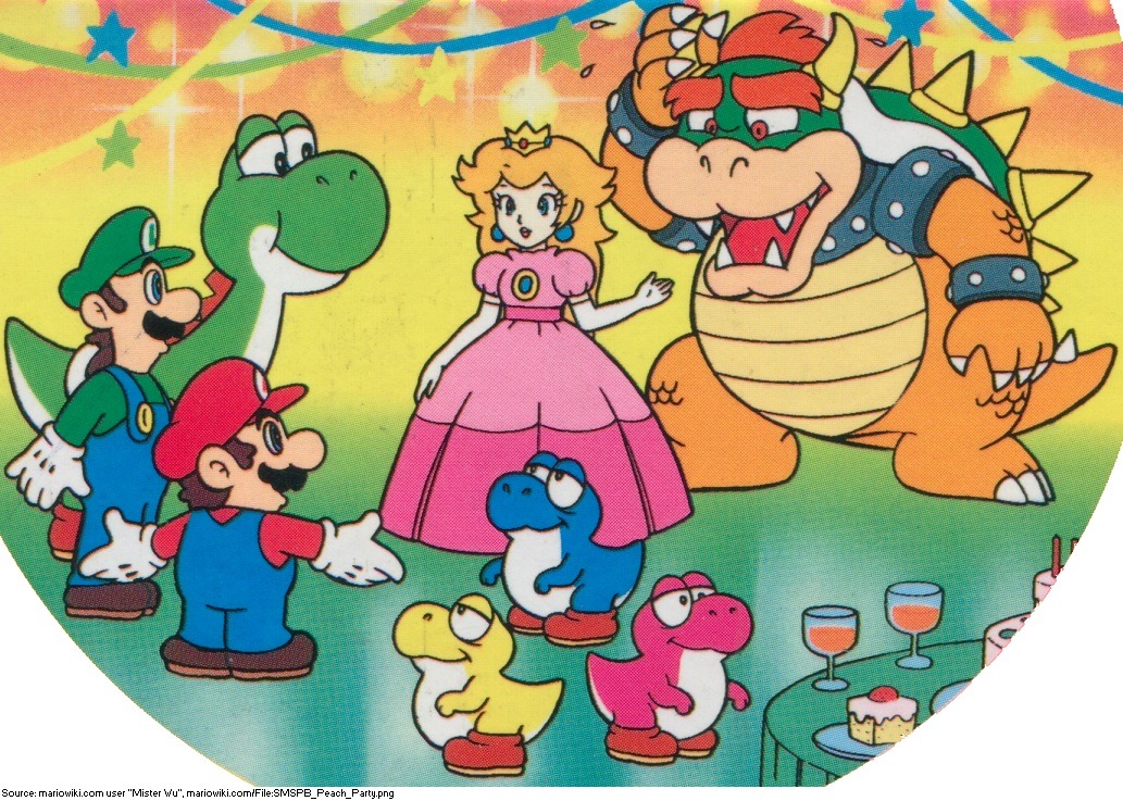 Super Mario World official artwork has an idiosyncrasy where whenever Mario’s cap is either not on Mario’s head, or not properly covering it, the cap shrinks in size considerably. I have provided pairs of similar artwork from the game where the image on the left shows Mario with his cap worn properly – note the standard size of the cap – and the image on the right shows Mario in a similar pose, but with the cap not worn properly. As you can see, the cap shrinks in size in both cases.